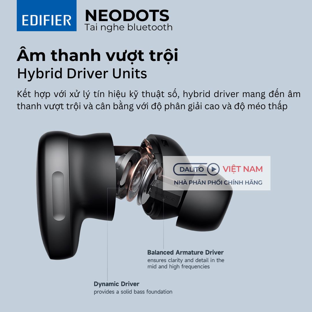 Edifier Neodots là dòng tai nghe true wireless cao cấp mới nhất, thể hiện một bước tiến quan trọng trong công nghệ âm thanh của Edifier. Sản phẩm được trang bị hệ thống driver kép hiện đại, kết hợp giữa BA và dynamic 10mm, đạt chứng nhận Hi-Res Audio Wireless, và tích hợp công nghệ chống ồn chủ động lai (Hybrid ANC), mang đến trải nghiệm âm thanh đẳng cấp phòng thu trong một thiết kế nhỏ gọn. Đây là lựa chọn lý tưởng cho những người dùng yêu thích tai nghe true wireless cao cấp với công nghệ tiên phong.